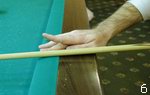 Положите кий на борт. Затем сверху на него опустите кисть. При этом большой палец заведите под ладонь так,