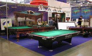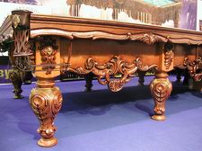 Однако выставленные на стенде товары заинтересовали посетителей ещё больше. В центре всеобщего внимания, конечно же, оказались бильярдные столы. Прежде всего – 12-футовый красавец ручной работы из массива ясеня. Богатством своей резьбы он восхищал всех и каждого. Счастливчик, который станет обладателем этого шедевра, не прогадает – ведь стол уникален и другого такого не существует.