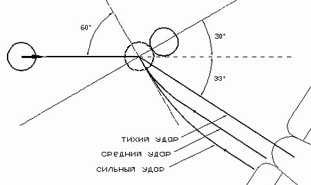 На тихих ударах криволинейный участок траектории практически не виден. Исходя из сказанного, угол между линиями а) чужой шар – луза б) свой шар – чужой шар, должен быть не более 33 градуса. Если он равен 33 градуса, целиться надо по касательной к чужому шару. Если этот угол меньше 33 градусов, целиться надо или тоньше указанной точки или толще, если при этом шар вращается вокруг вертикальной оси, он, в зависимости от направления вращения, изменяет траекторию финального участка на несколько градусов в ту или иную сторону.