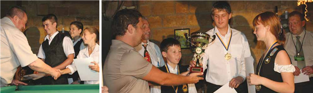 Три дня в клубе кипели страсти и разворачивались настоящие баталии. Накал страстей был не меньший, чем на чемпионатах Европы и мира.. Юные игроки подарили присутствующим захватывающее зрелище. Победителей наградили грамотами и медалями, от спонсоров турнира руководителей бильярдного клуба "Один" ребятам вручили памятные подарки и сувениры. Чемпионы получили в подарок - кии мастера из Кривого Рога Александра Шкуратова.