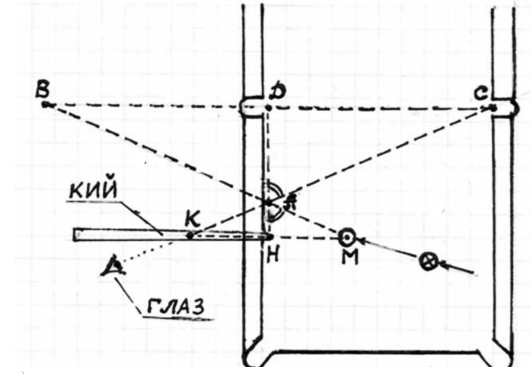 Для нахождения точки «А», в которую нужно попасть чужим шаром, положим кий перпендикулярно длинному борту так, чтобы наклейка кия находилась над центром чужого шара и отметим на кие пальцем расстояние между шаром и бортом (точкой «Н»). Затем, не отрывая палец, передвигаем кий по его оси так, чтобы наклейка находилась в точке «Н». Тогда зафиксированная пальцем отметка будет в точке «К», а отрезок МН будет равен отрезку КН. Наклонившись, совмещаем взглядом в одной линии точку «К» на кие и прицельную лузу (точку «С»). Там где эта линия пересекает внутреннюю грань борта (точнее в радиусе от него) и будет находиться искомая точка «А». Эту точку следует запомнить, переходя на противоположную сторону стола для удара