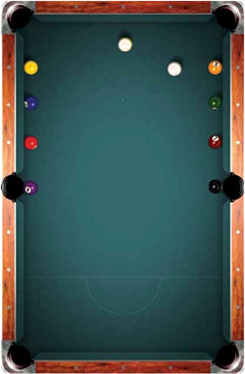 Описание упражнения: объектный шар размещается на точке пересечения перпендикуляров, проведенных через первые бриллианты короткого и длинного бортов. Вплотную к резине одной половины длинного борта напротив бриллиантов и центральной лузы выставляют еще 4 шара на одной стороне и столько же на другой. После того как объектный шар забит в угловую лузу нужным ударом, биток должен коснуться поочередно одного из 8-ми шаров без предварительного касания бортов.