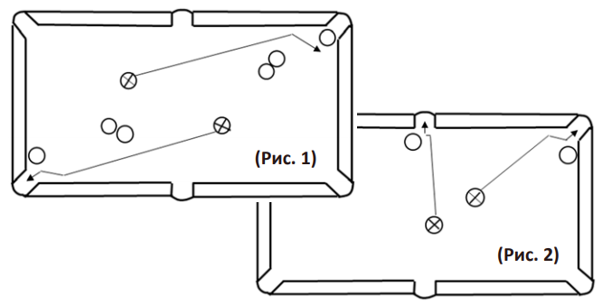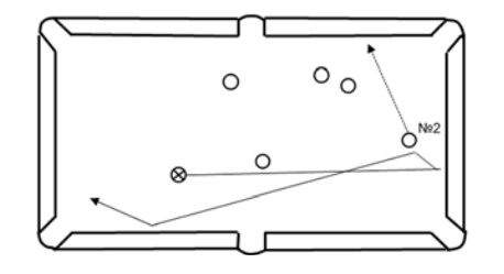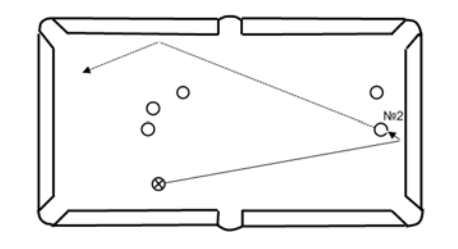 Забить шар №2 в указанной позиции практически нельзя. В данной позиции лучше отыграться ударом от короткого борта с левым боковиком несильным ударом, стараясь поставить шар №2 в «маску» за другие шары, как это показано на рисунке. Обычно при таком ударе катящийся биток, отскакивая от борта, имеет обратное вращение, и после удара в прицельный шар останавливается на месте. Т.е. облегчен контроль своего шара.