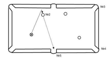 Забить шар №2 в угловую лузу №3 напрямую или дуплетом в лузу №4 мешают другие шары. Дуплет или оборотный в среднюю лузу №5 не проходит из-за «контртуша». Здесь может выручить удар от длинного борта, как бы с тыла. Такой удар иногда называют «каблук» (наподобие удара «пяткой» в футболе).