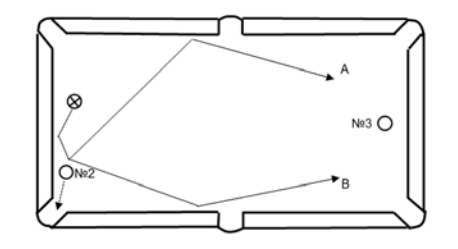 Забив шар №2, нужно выйти под шар №3. Биток, шар №2 и луза находятся на одной линии. Накатом играть нельзя. На оттяжке, даже очень сильной, биток не выйдет за среднюю линию. Если ударить от борта на оттяжке с правым боковиком, биток выходит в точку «А». Такой же удар небольшим накатом с левым боковиком ставит биток в точку «В».