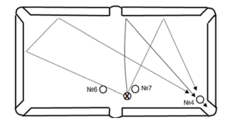 Очередной шар №4 стоит у лузы. Забить его напрямую или дуплетом от длинного борта, применяя правило «угол падения равен углу отражения», мешает шар №7. Играть необходимо дуплетом от двух бортов (короткий, длинный) мешает шар №6 (траектория показана пунктиром). В такой позиции может выручить удар слегка наклонным кием под низ шара с сильным правым боковиком (траектория показана сплошной линией).